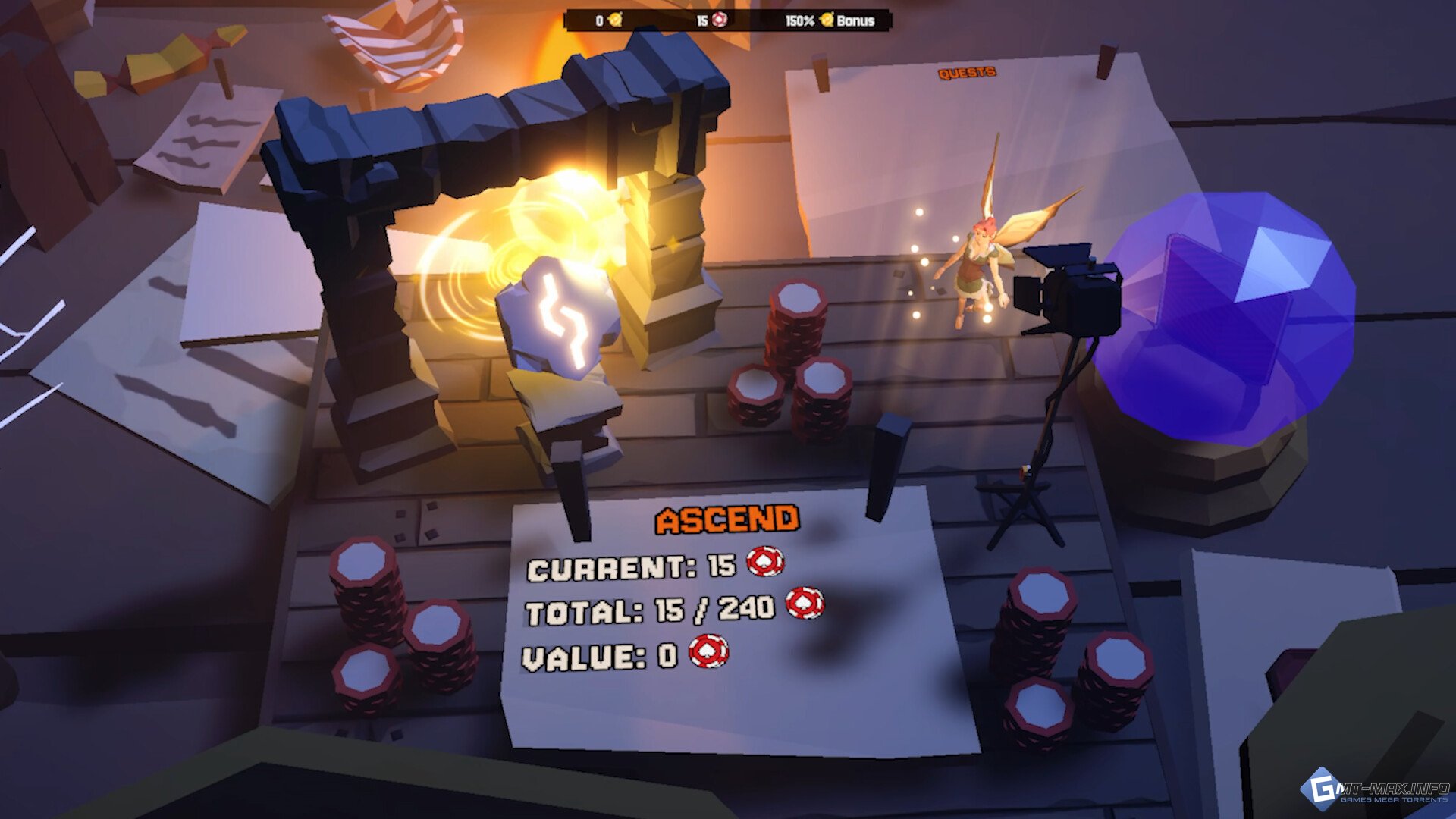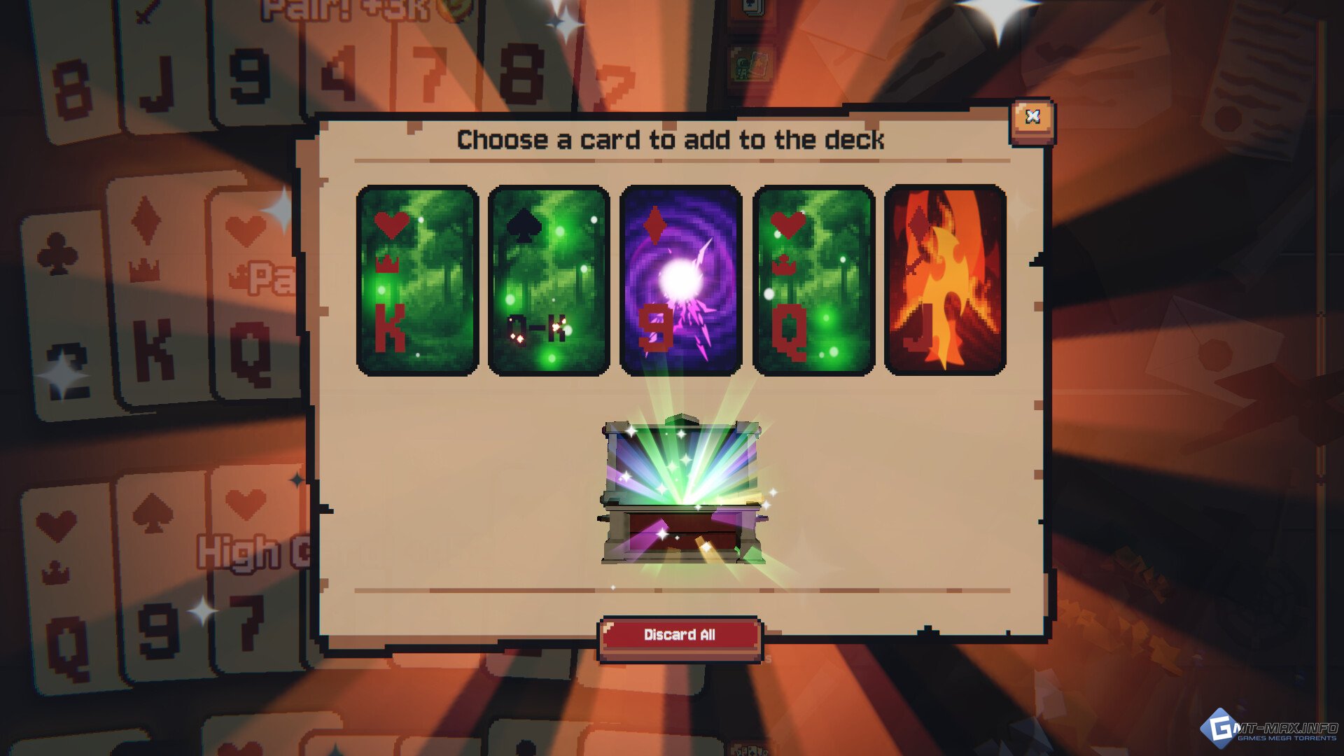 ДОСТИГНИ ВЕЛИЧИЯ Заключи сделку с Шутом, чтобы начать заново в обмен на покерные фишки (Фишки, чего? Это даже не покер...), а также покупай на них мощные улучшения.