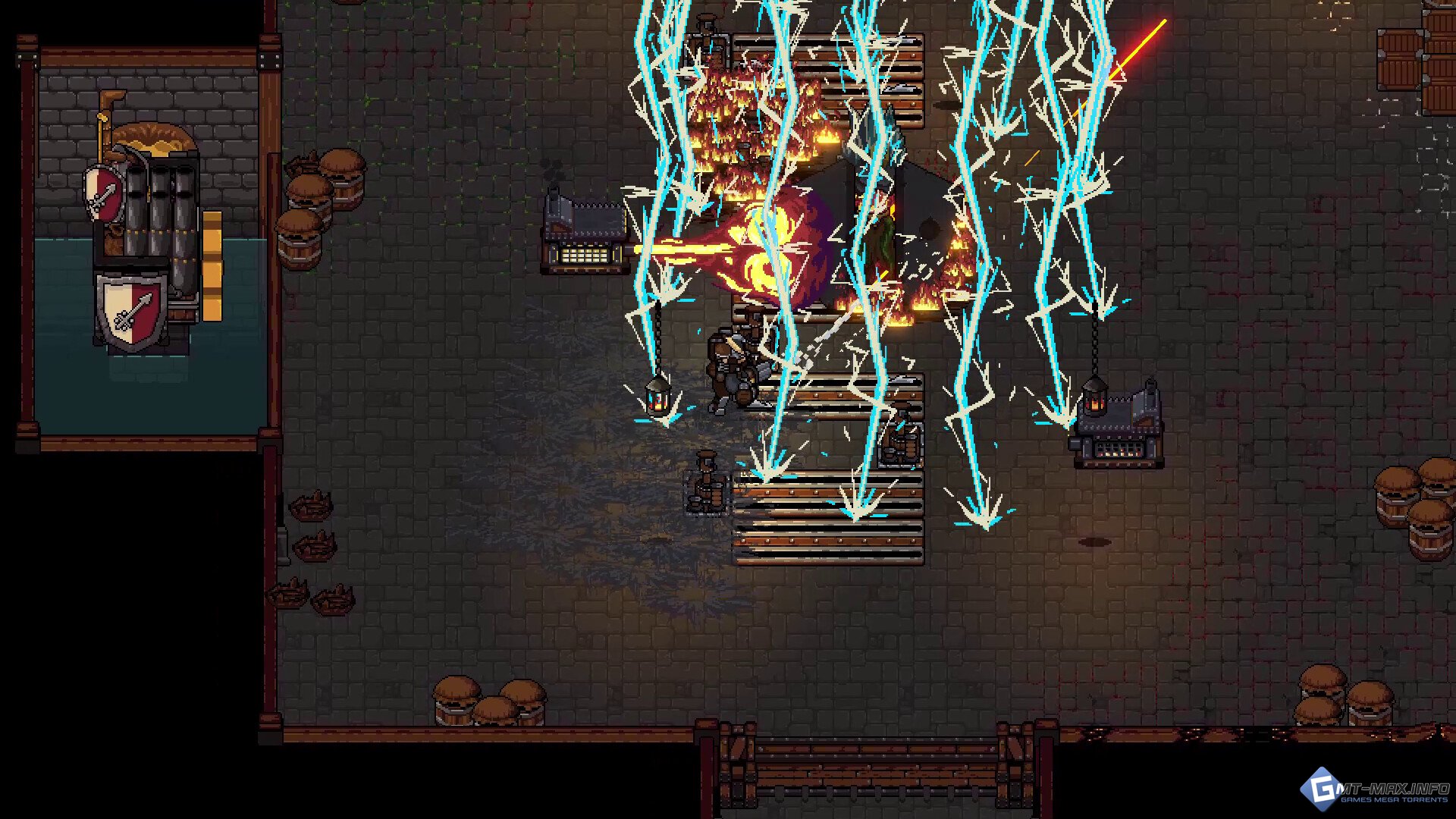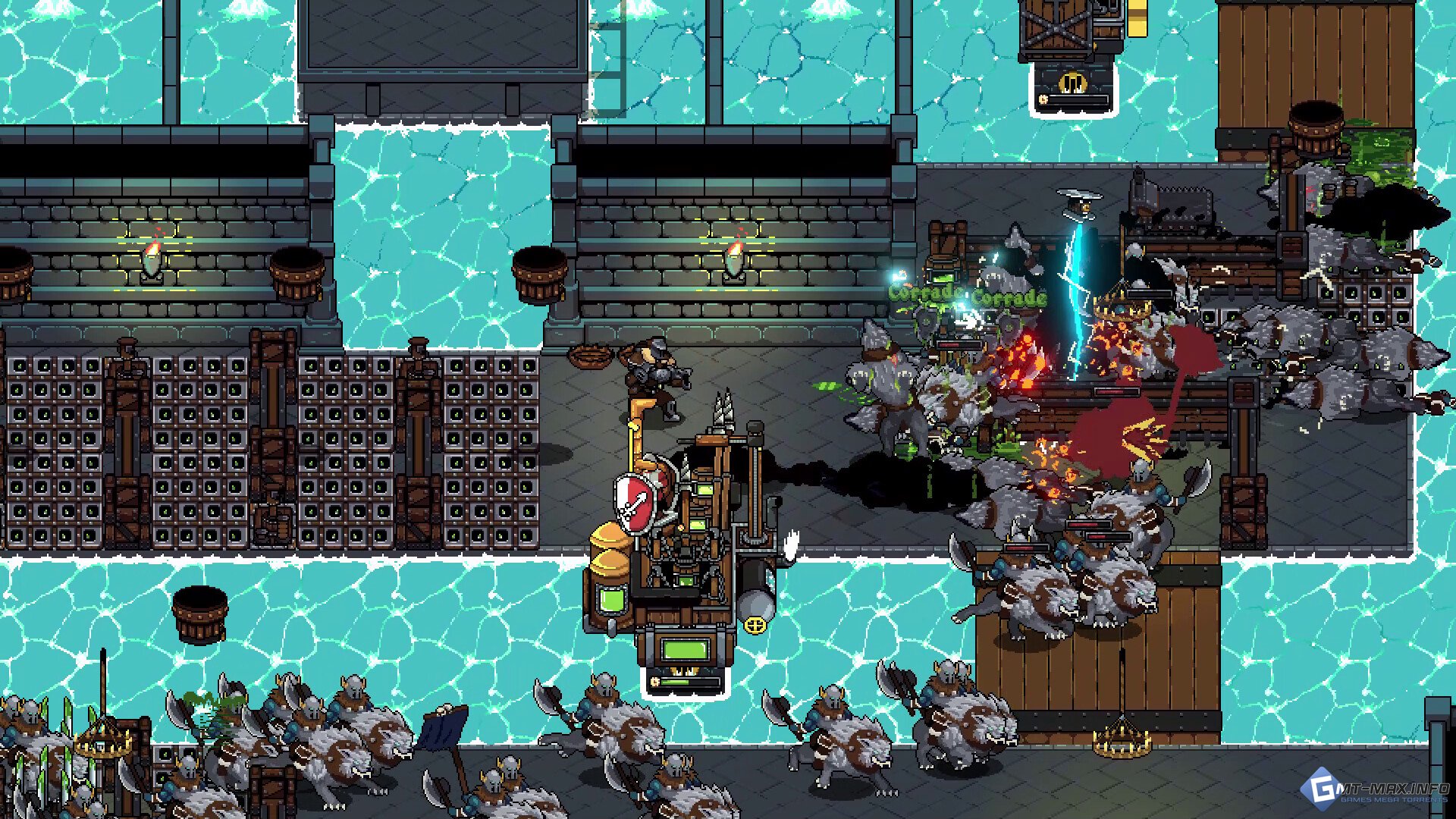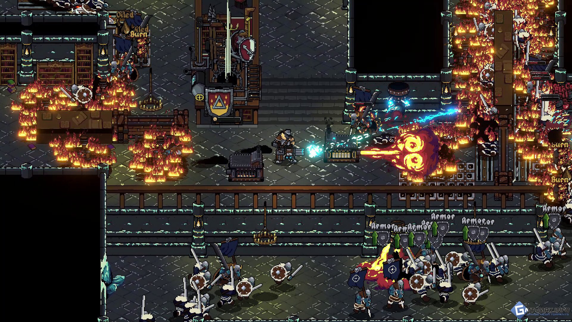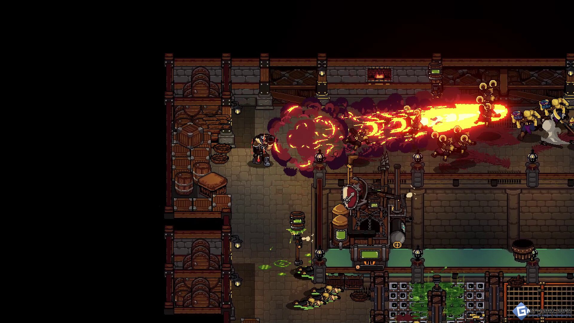Используйте синергии для быстрого уничтожения врагов: ударьте металлические ловушки электричеством, подожгите масло или электрифицируйте лужи кислоты, чтобы распространять взрывоопасные ядовитые газы.